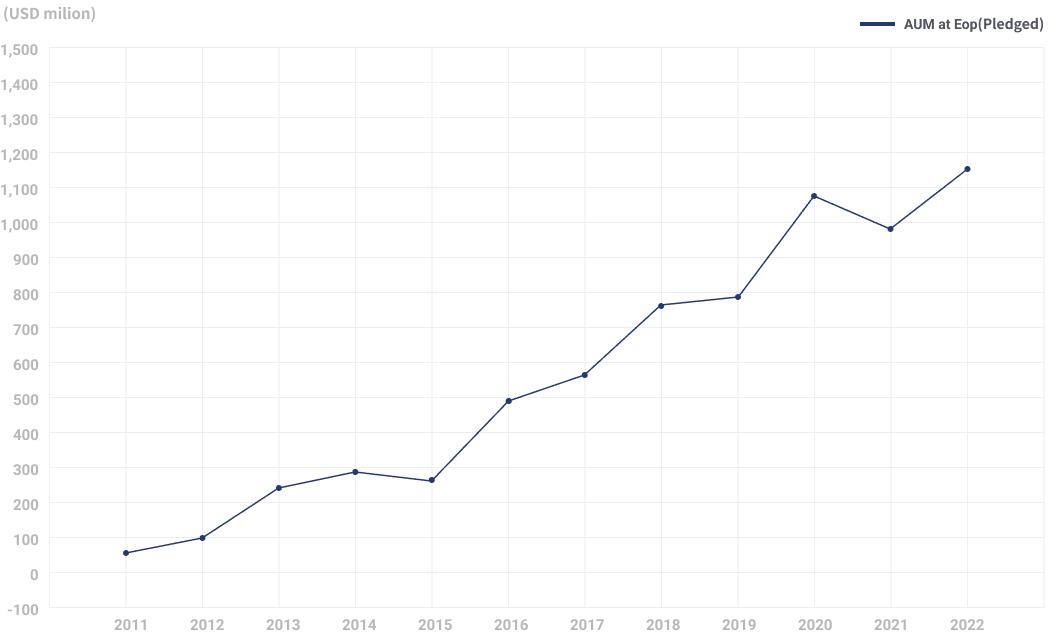 | AUM at EoP(Pledged) | 66 | 99 | 236 | 296 | 269 | 491 | 566 | 769 | 781 | 1,070 | 990 | 1,152 |